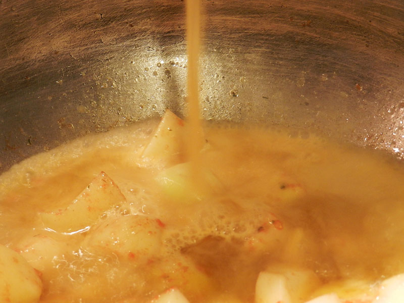 Si veiéssim que les patates no estan cuites i la quantitat de fumet es va reduint per la cocció, n’hi afegirem un cullerot més de fumet. Sempre a foc fort.
