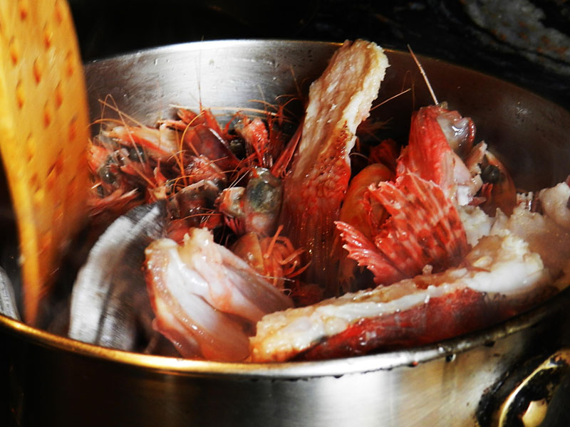 En una olla grossa hi aboqueu un raig generós d’oli i quan sigui ben calent hi aboqueu tots els caps, cues i espines. Guardeu el fetge per després. Aneu remenant la cassola uns cinc minuts a foc fort perquè aquests trossos no s’enganxin massa al cul de la cassola. Es tracta de torrar aquestes parts per tal de que el fumet que farem quedi més intens (reacció de Maillard). Aquests torrats es dissoldran a l’aigua del fumet.