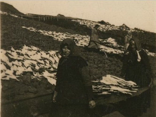 Dones realitzant feines d assecatge del bacallà a Faskrudjördur, Islàndia, 1933. Col·lecció Tomàs Mallol. CRDI - Ajuntament de Girona.