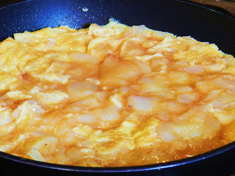 Si ho fem així les rodelles de patata queden toves i flonges per dins i l’enrossit exterior millora el gust final de la truita. No han de semblar bullides.