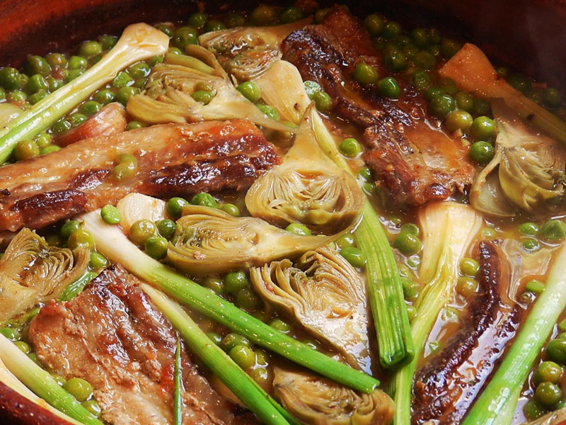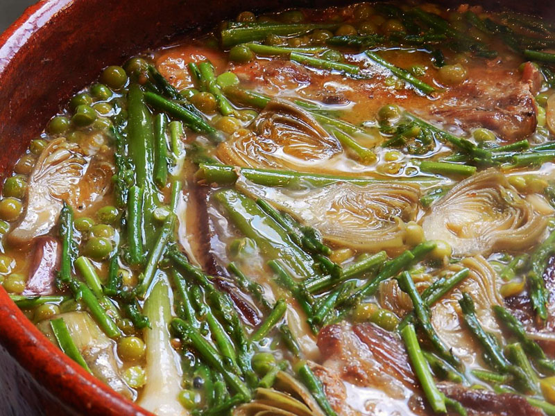 En aquesta recepta aprofitem les darreres i delicioses verdures de l’hivern i les primeres de primavera com són les carxofes, els pèsols i espàrrecs. Podríem incorporar-ne d’altres com cebes tendres, espinacs... Tan sols hi fem un petit, senzill i modest però efectiu sofregit, amb una dent d’all i una tomata. Una manera diferent i molt més saborosa de menjar verdures. Podríem fer aquesta mateixa cassola sense carn, només amb els vegetals. Aquí la fem amb xulles de cansalada, que si volem també les podem substituir per trossos de conill, costelló de porc, pollastre, etc...