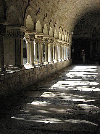 El claustre està constituït per quatre galeries desiguals en llargada i en el contingut d'arcs i pilars. Aquests no sobresurten del gruix del mur i es veuen repartits a les cantonades i als punts intermedis de cada crugia. Les arqueries són de mig punt amb guardapols i estàn assentades sobre un podium corregut. Tant a l'interior com a l'exterior, els ressalts del guardapols s'uneixen en un punt d'intersecció mitjançant unes columnetes talladas al mur. Aquest sistema va ser emprat a la galeria més antiga del claustre del monestir de Ripoll. Les columnes són aparellades i els seus capitells estàn treballats amb diversos temes. Les galeries sud, est i oest estàn cobertes amb volta de quart de canó, mentre que la nord és de mig punt. Seguint l'exemple del claustre d'Elne, els pilars estàn decorats amb frisos de temes religiosos que segueixen un fil argumental, i també amb temes vegetals, quotidians i zoomòrfics. ![]()