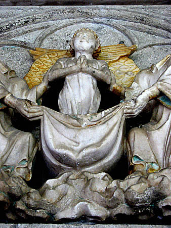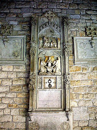 Entre les làpides, sepultures, sepulcres i ossaris empotrats als murs dels claustres, destaca per la seva vistositat una peça vertical, desenvolupada per franges, amb baixos i alts relleus, decoratius els uns i figurats amb àngels els altres.