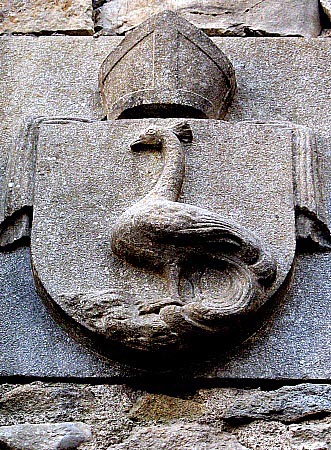 Escut del bisbe Bernat de Pau, timbrat amb la mitra de bisbe, a la font de la Plaça dels Lledoners