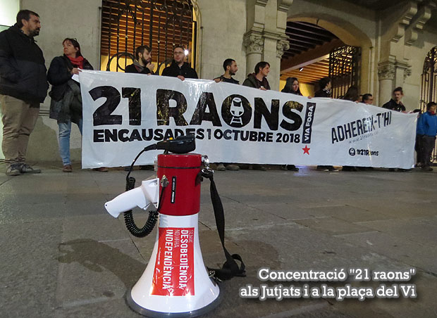 El dijous 14 de març de 2019, va tenir lloc una concentració a la plaça del Vi, convocada per Via Fora i la campanya #21 raons, en suport als encausats pels talls de les vies del TAV que es van fer a l'aniversari de l'1-O, que va ser seguida per unes 200 persones.