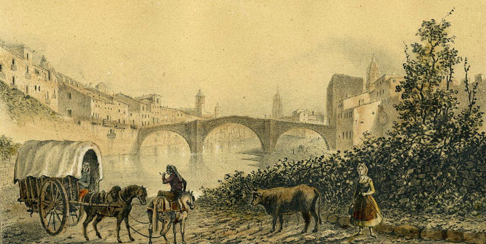 - Vista del riu Onyar a Girona, amb el pont de Sant Francesc a la part central i la torre homònima, a la dreta. A l'esquerra del riu, el campanar de les Bernardes i el del convent de Santa Clara. 1839. Francesc Xavier Parcerisa Boada (gravador). CRDI - Ajuntament de Girona.