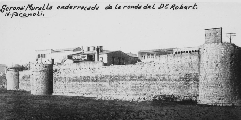 - Vista parcial del tram de muralla del Mercadal compresa entre els baluards de Sant Francesc i el de Santa Clara, paral·lel a la ronda del Doctor Robert, posterior ronda Pare Claret. En segon pla, l'edifici de l'hospital de Santa Caterina. 1910-1915. Valent&uiacute; Fargnoli i Annetta. CRDI - Ajuntament de Girona.