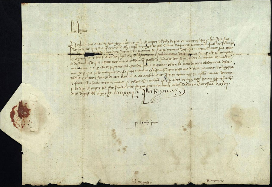 - 27 d'agost de 1432. La reina Maria, esposa i lloctinent del rei Alfons IV, als jurats i prohoms de la ciutat de Girona. Ateses les molèsties i opressions que han causat al convent de Framenors a propòsit d’una qüestió amb les monges de Santa Clara, els mana que cessin de perjudicar l’esmentat convent. Lletres Reials. Fons Ajuntament de Girona.