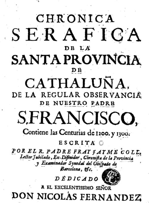- "Chronica Serafica de la Santa Provincia de Cathaluña de la Regular Observancia de nuestro Padre S. Francisco". Fra Jaume Coll. 1738. Barcelona.