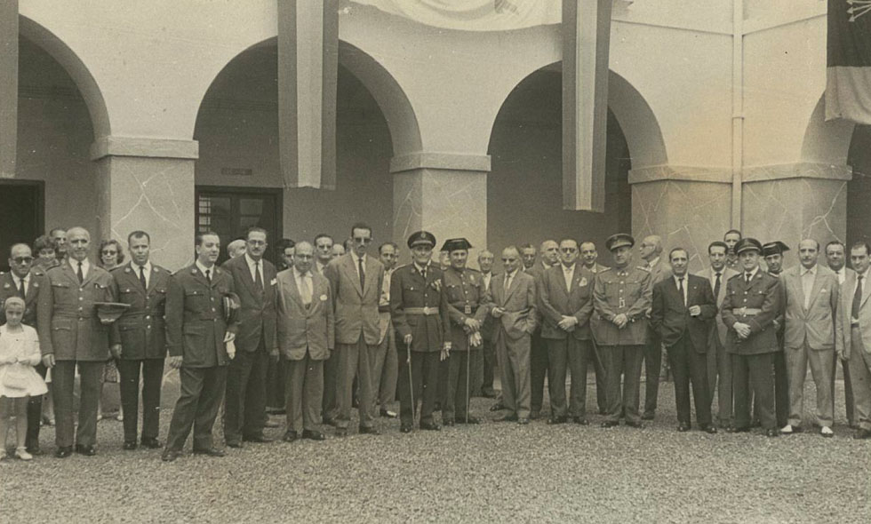 - Celebració de la festivitat de la Mercè, patrona de les institucions penitenciàries, a la Presó Provincial de Girona, emplaçada a l'antic convent de Santa Clara al Veïnat. Retrat de grup al pati del centre. 1950-1960. Salvador Crescenti Miró. CRDI - Ajuntament de Girona.