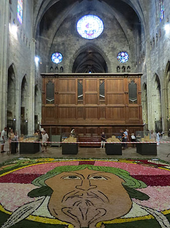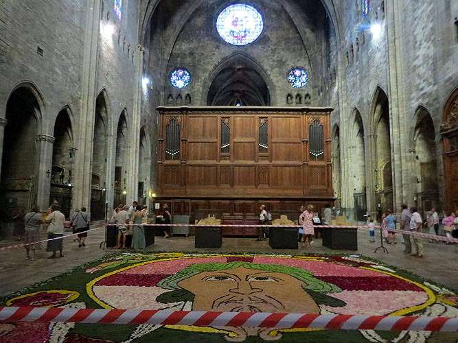 Al llarg de la jornada, desenes de voluntaris de la dotzena de confraries que conformen la Junta de Confraries van engalanar els carrers del Barri Vell amb les catifes amb decoracions florals, com a preludi de la solemne missa major que es va dur a terme a la Catedral i que va donar el tret de sortida a la processó, que va desfilar fins a la Basílica de Sant Feliu.