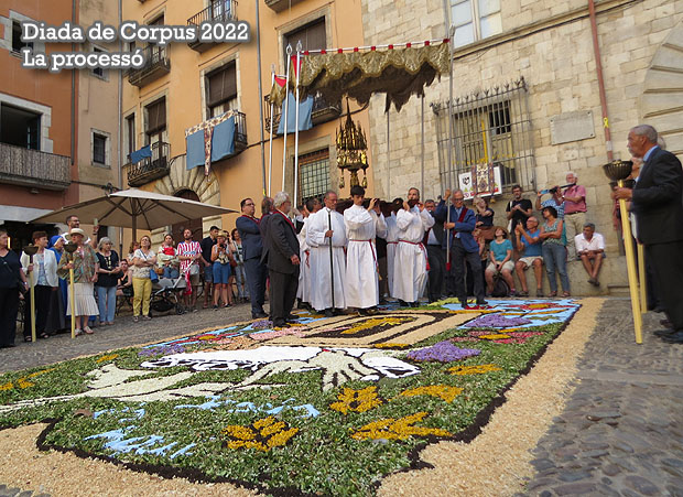 Al llarg de la jornada, desenes de voluntaris de la dotzena de confraries que conformen la Junta de Confraries van engalanar els carrers del Barri Vell amb les catifes amb decoracions florals, com a preludi de la solemne missa major que es va dur a terme a la Catedral i que va donar el tret de sortida a la processó, que va desfilar fins a la Basílica de Sant Feliu.