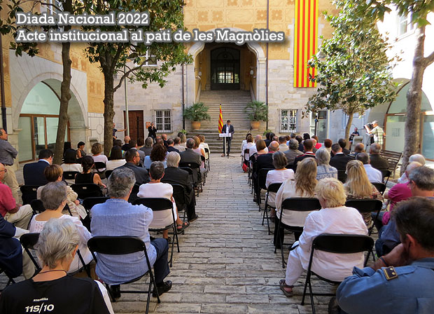 El diumenge 11 de setembre de 2022 va tenir lloc al Pati de les Magnòlies de la Delegaci&oacuute; de la Generalitat, el tradicional acte institucional, que des de fa dotze anys organitzen conjuntament la Generalitat, la Diputació i Ajuntament de la ciutat. Hi varen participar amb els seus parlaments la delegada del Govern a Girona, Laia Cañigueral, el vice-alcalde de la ciutat, Quim Ayats, i el president de la Diputació de Girona, Miquel Noguer. L'acte de la Diada a Girona es va tancar amb el cant de "Els Segadors". El saxofonista olotí Dani López, va ser l'encarregat d'obrir l'acte amb la interpretació del Cant dels Ocells, i l’Hereu Riera amb la guitarra.