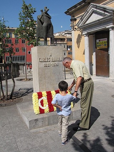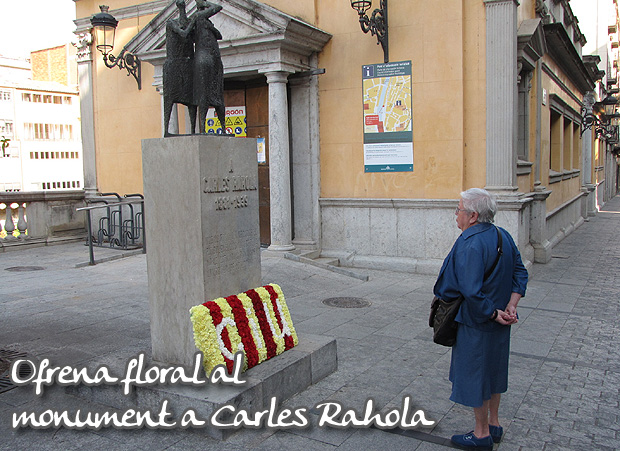 Síntesi: Convergència de Girona ha fet la tradicional ofrena floral al monòlit dedicat a la memòria de Carles Rahola, situat a la Rambla de la Llibertat. L'acte ha finalitzat, després dels parlaments d'Isabel Muradàs, Joan Bagué i Carles Puigdemont, amb el "Cant dels Segadors" per part de tots els assistents a l'acte. Aquest monument, coronat per una escultura de Torres Monzó, mostra la inscripció "A Carles Rahola. 1891-1939. Que no torni a aixecar-se el patíbul en el clos august de la noble i estimada Girona ni en qualsevol altre indret del món", fragment del seu llibre "La pena de mort a Girona", i, al dors, segueix: "Assemblea Demo-cràtica d'Artistes i col·laboració de l'Ajuntament. 23 d'abril de 1978".