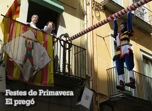 La pregonera va aprofitar per anunciar que enguany el personatge apareixerà quatre vegades: vestit ara d'arlequí, també penjarà del carrer Argenteria per Sant Joan, vestit de pagès, per les Fires de Sant Narcís, vestit de gala, i per Nadal, vestit de patge, amb l'objectiu de donar-li més protagonisme.