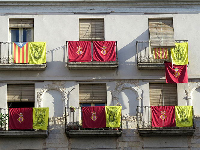 Imatges diverses de les Fires de Sant Narcís a Girona. La policia municipal de gala la diada de Sant Narcís, concerts de bandes, decoracions de balcons amb domassos, fires i mercats de productes alimentaris artesans, etc.