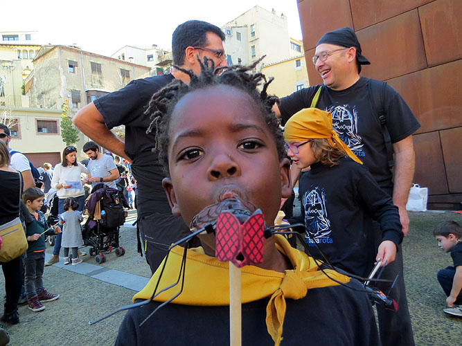 Reportatge fotogràfic del taller organitzat per la Mula Baba de construcció de mosques a la plaça del Pallol. 9 fotografies. |