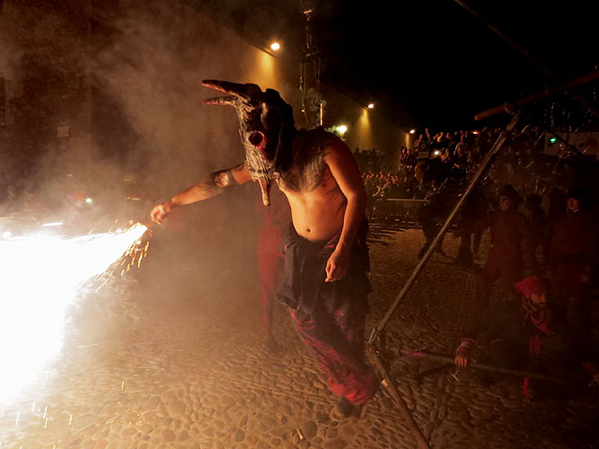 Reportatge fotogràfic de l'espectacle de Fal·lera Girona i els Diables de l'Onyar amb el Beatusaure i el petit Drac Major, acompanyats de la Bruixa de la Catedral. 39 fotografies. |