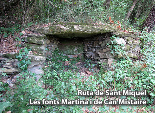Seguint la ruta del castell de Sant Miquel, Ens desviem uns instants del camí principal per observar l'antiga font Martina. Aquesta és una de les més de 250 fonts que ocupen el massís de les Gavarres. L’orografia i la geologia de les Gavarres faciliten l’existència de nombrosos cursos d’aigua i una gran quantitat de fonts. Tot i així, en aquest massís l’aigua sempre ha estat un recurs escàs, de manera que s’ha aprofitat al màxim la possibilitat d’obtenir-la.