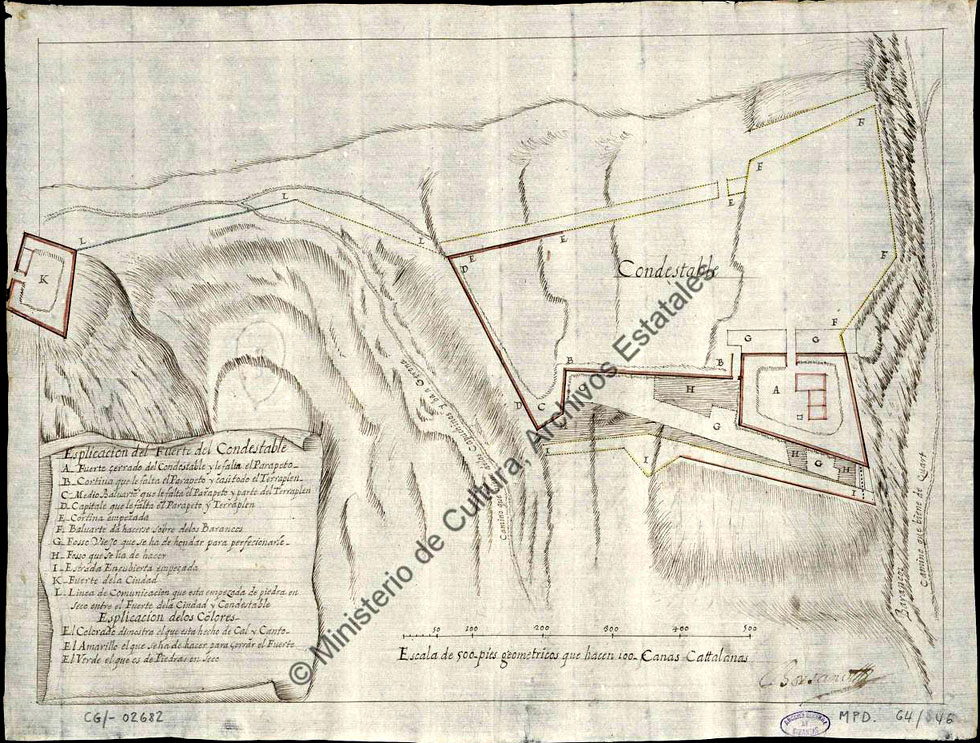 (Ampliar) - Plano del Fuerte del Condestable. 1685. Archivo General de Simancas. Gentilesa de Sergi Moreno. L'entrada de Noailles a Girona. Durant la Guerra dels Nou Anys, un document signat a Madrid amb data de 8 de juliol de 1694, narra que "El dia 12 de junio el Duque de Noailles empezó a circuir con su ejército la ciutat de Gerona [...] y el dia 22 puso batería en la montaña y batió por algunas horas el convento de los Capuchinos [...] y luego se puso a trabajar dichos ataques para las baterias contra el fuerte del Condestable y lo demás de la plaza [...] y empezó a batir dicho fuerte hasta el día 25, y abiendo brecha el día 27 en dicho fuerte, lo desampararon los nuestros y lo mismo hicieron los de los fuertes del Cabildo y Ciudad, retirándose a la plaza. Continuó el enemigo haciéndose dueño de dichos fuertes, a batir la ciudad". ("Documentos inéditos referentes a las postrimerías de la Casa de Austria en España, Volum 1. Adalberto (Prince of Bavaria), Gabriel Maura Gamazo. 2004. Centro de Estudios Políticos y Constitucionales. ISBN 84-2591-275-7).