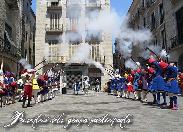Arribades les formacions a la plaça del Vi, va tenir lloc la presentació de l'esdeveniment i els grups que hi participen. La presentació va anar a càrrec del regidor Eduard Berloso i del president de l'Associació Miquelets de Girona - Regiment de Sant Narcís, Jesús Pastor. Finalitzada la presentació, va tenir lloc la recreació de la jura de bandera. L'activitat va finalitzar amb el cant de "Els Segadors".