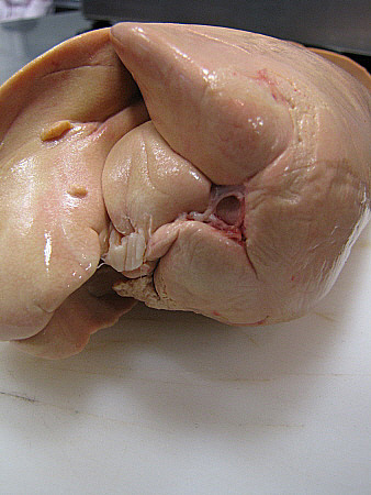 Temperar el fetge d'ànec. Treure les venes amb molta cura, salpebrar-lo i afegir l'Oporto.