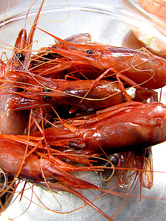 Separar el cap del cos de les gambes. Sofregir lleugerament els caps amb oli verge i a foc viu junt amb les làmines d'all. Un cop daurats ambdós, incorporar pebre vermell i mullar amb sopa de peix fins a cobrir. Coure durant 5 minuts, colar i reservar.