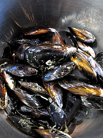 Netejar el quilo de musclos amb aigua freda i obrir-los al vapor per recuperar l'aigua de mar que desprendran. Separar la carn de la clova i reservar-la per introduir-la a l'arròs a mitja cocció.