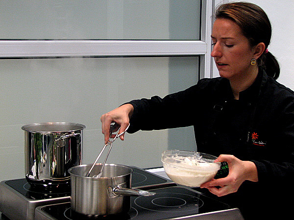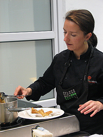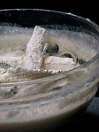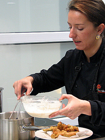 Fem la massa de la tempura: en un bol i per aquest ordre hi posem el ous amb la mel i remenem amb unes varetes, després la gasosa i la farina i per últim la sal. Aquesta massa ha d'estar molt freda.
