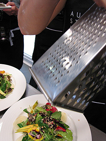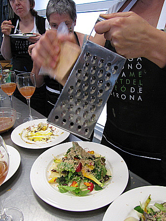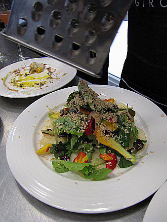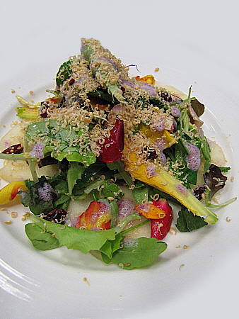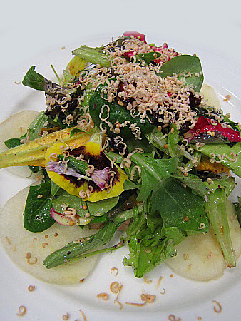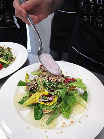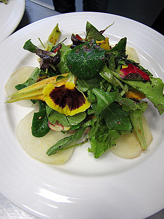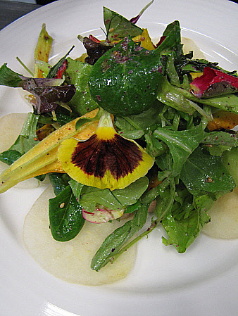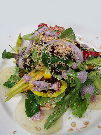 Amanida de pera, mesclum de flors i encenalls de foie amb aire de saüc