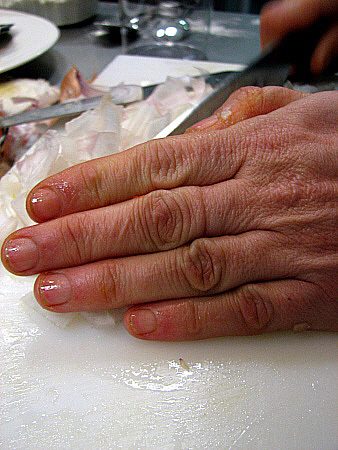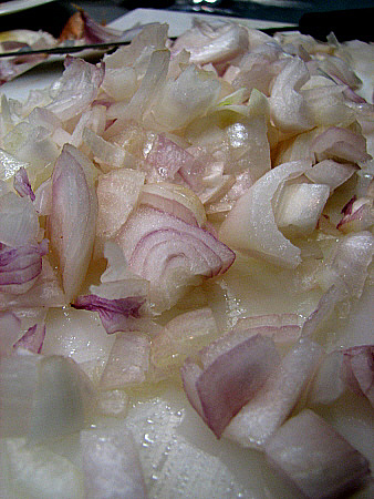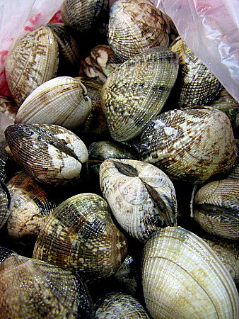 Cuinem les cloïsses com si fossín a la marinera: piquem una ceba ben menuda i 4 grans d'all amb un raig d'oli d'oliva, el vi blanc, el julivert picat i la cullerada de pebre vermell. Ho deixem reduir una mica i hi afegim les cloïsses fins que s'obrin.