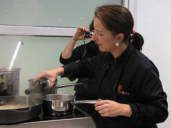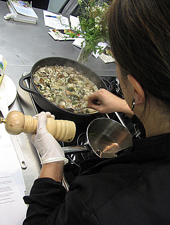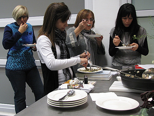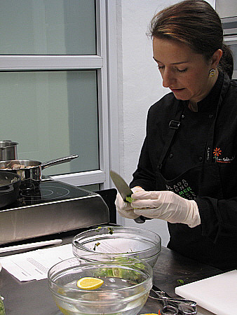 Rectificar de caldo si cal. Servirem l'arròs que quedi caldós i per sobre hi posarem unes fulles tendres picades en juliana.