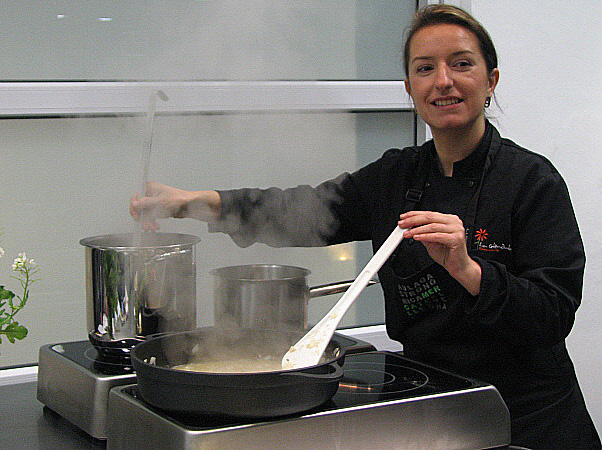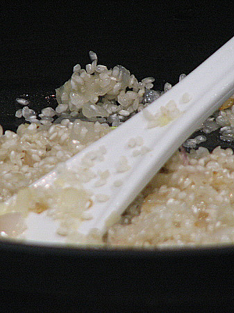 En una cassola sofregim una ceba i hi tirem l'arròs, remenem una mica i hi afegim les tiges de borratja i remullem amb el caldo de bullir-les i una mica de sal.