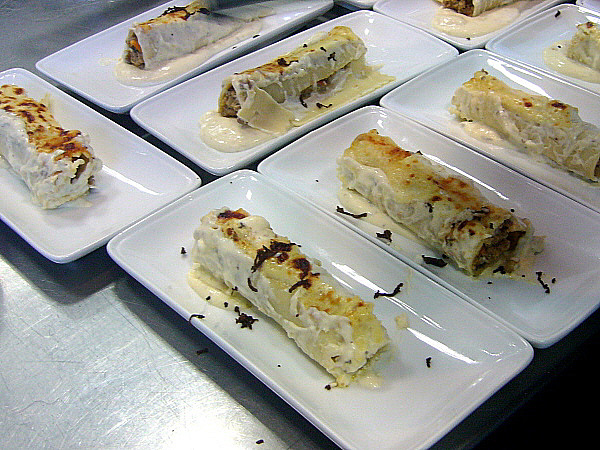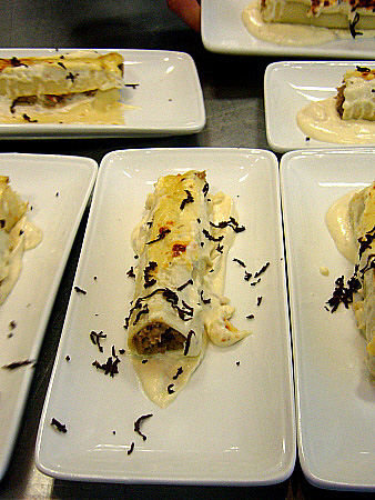 Caneló de carn, foie i tòfona amb beixamel suau de parmesà