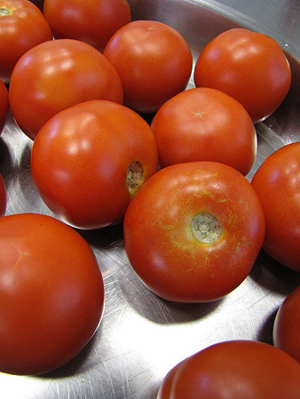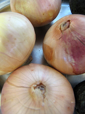 Tallem la ceba molt fina. Posem aigua a bullir, hi posem el tomàquet durant mig minut per escaldar-lo, i el pelem.