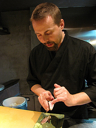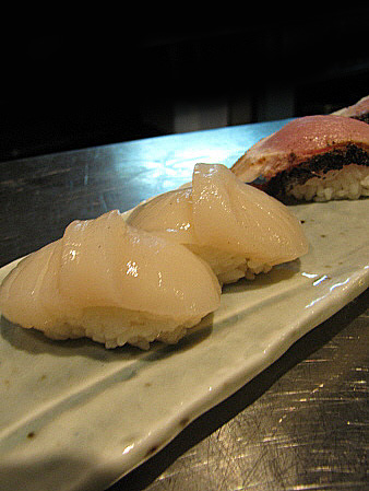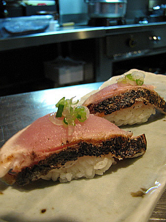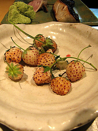 | Sushi nigiri de vieira amb maduixa albina, d'anguila caramelitzada amb hibiscus, i de salmó salvatge amb borraina.[Pujar] | ||||||||||