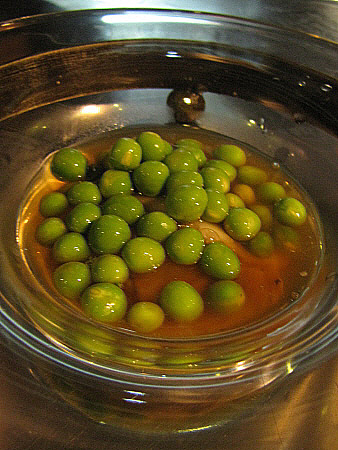 | Ostra oculta en brots i pèsols, amb infusió floral.[Pujar] | ||||||||||