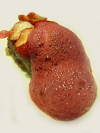 | Pa de crisantems, maduixes Charlotte i salsa escumosa d'hibiscus. [Pujar] | ||||||||||
