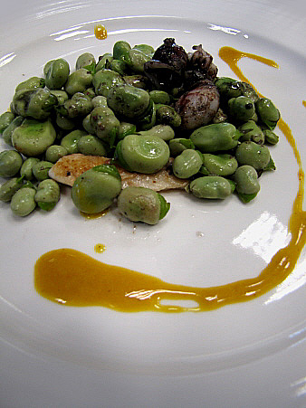 Per muntar el plat esmicolarem el peix, el barrejarem amb les faves i les sepiones, i el decorarem amb l'emulsió de brou de crustaci.