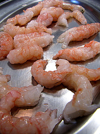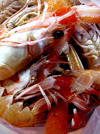 Pelar i netejar les gambes o els escamarlans, i guardar els caps i les cues, que saltejarem a continuació. Posar les cues i els caps en un "xinès", i aixafar-los fins a obtenir un brou de crustaci.