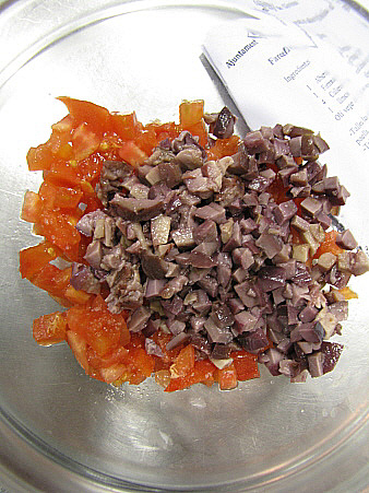 Pasta farcida amb tomàquet, olives i formatge Flor de Neu