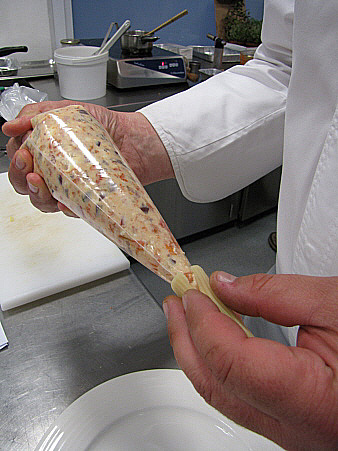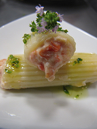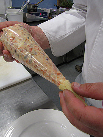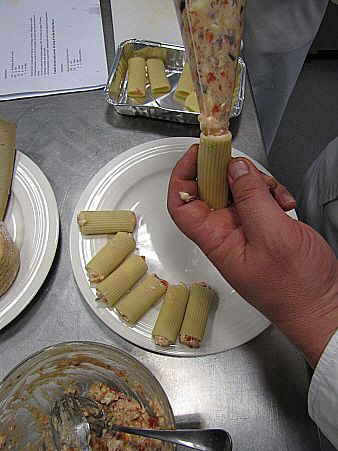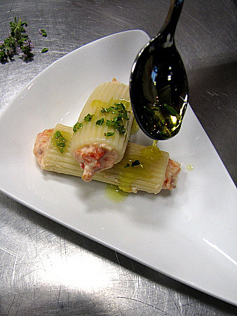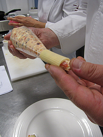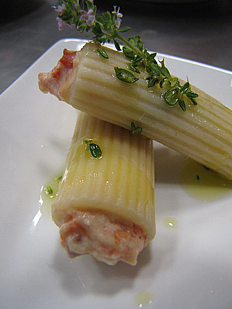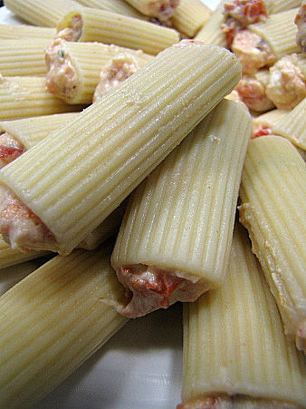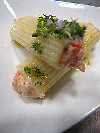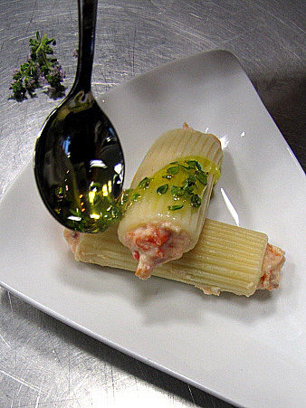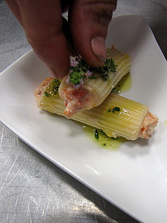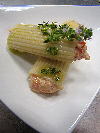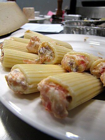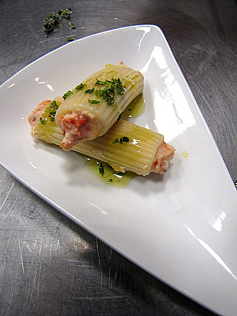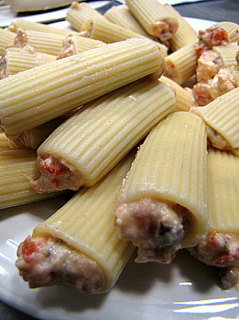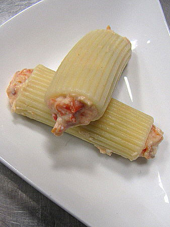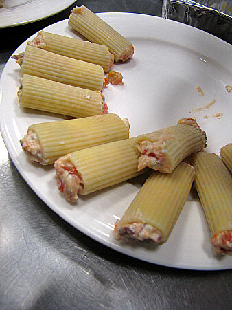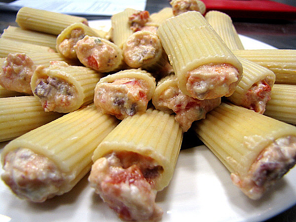 Pasta farcida amb tomàquet, olives i formatge Flor de Neu