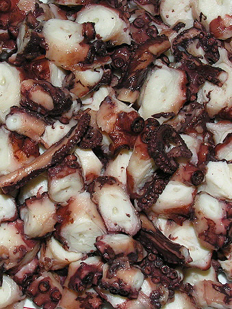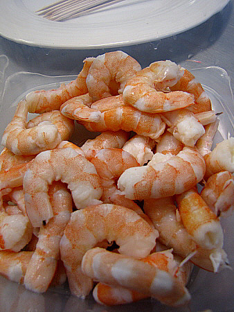 Tant el pop com les gambes es poden comprar cruits. Pelar, si cal, les gambes (o llagostins). Tallar els bitxos per la meitat.