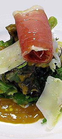 Amanida tèbia de peus de porc, tallarines de calamar i gamba de Palamós