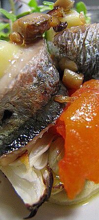 Suquet lleuger de fonoll i nècora amb llobarro al forn