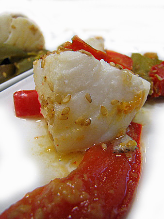 Un cop cuit el pebrot, s'afegeixen el bacallà amb talls de llimona confitada, i es tapa per coure amb el vapor.