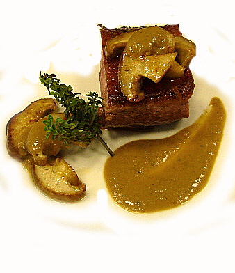 Magret d’ànec rostit amb ceps i suc de farigola llimonera