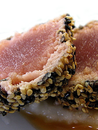En un bol barrejarem el sèsam blanc i el sèsam negre. Empanarem la tonyina i la fregirem en una paella amb una mica d'oli de gira-sol pels quatre costats, sense deixar que es cogui gaire.
