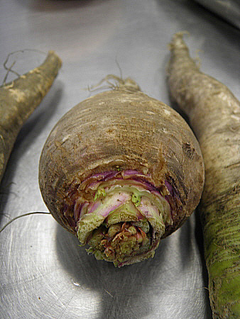 Tallarem la tonyina en rectangles d'uns 200 gms i deixarem temperar. Netejarem els naps i els tallarem a tacs.