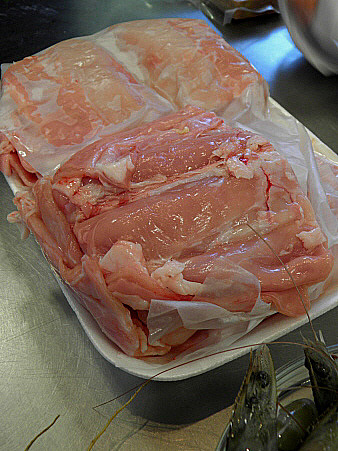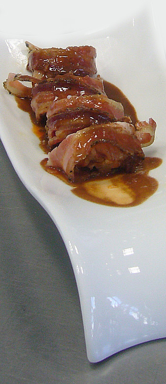 Posar la cansalada estirada a la taula de treball, posar-hi els lloms de conill al damunt, sal, pebre, farcir-los de foie i el llagostí prèviament pelat. Enrotllar-ho tot amb la cansala i reservar.